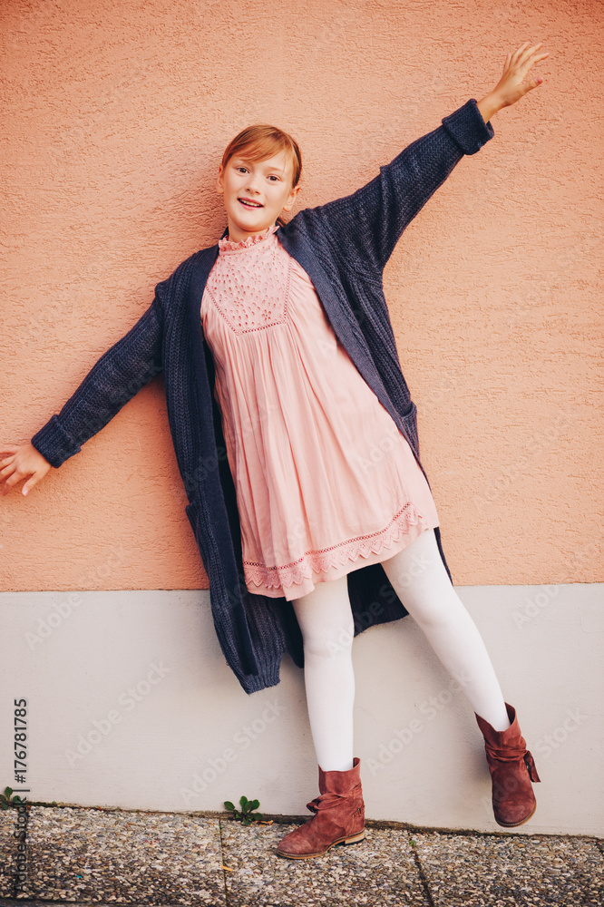 Outdoor portrait of adorable preteen girl wearing soft pink dress, kid model posing against beige wall background. Fashion for young teens