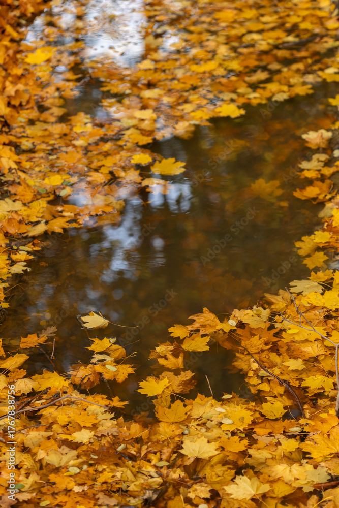 Jesienne, żółte liście klonu w wodzie, tapeta.