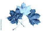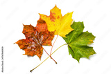 Three maple leaves in autumn colors, green yellow and red, with small shadows on a white background, seasonal greeting card or fall sale advertisement