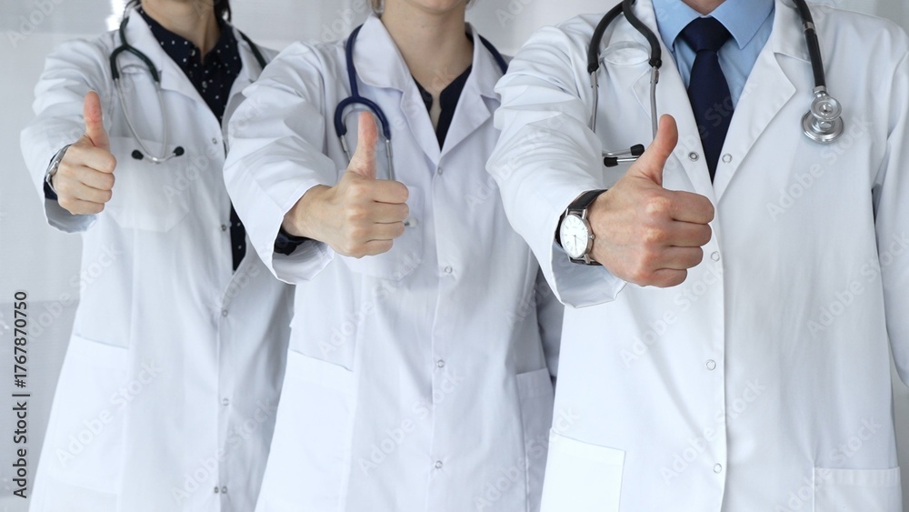 Doctor team showing thumbs up, symbolizing healthcare success, medical approval, achieving goals, quality patient care, positive health outcomes, and professional support