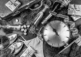 LATIN AMERICAN AND SPANISH NEW YEAR TRADITIONS. empty suitcase, lentil spoon, yellow interior clothes, gold ring in champagne, 12 grapes, money in shoe - CHILEAN MONEY. Christmas background