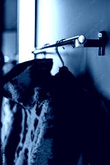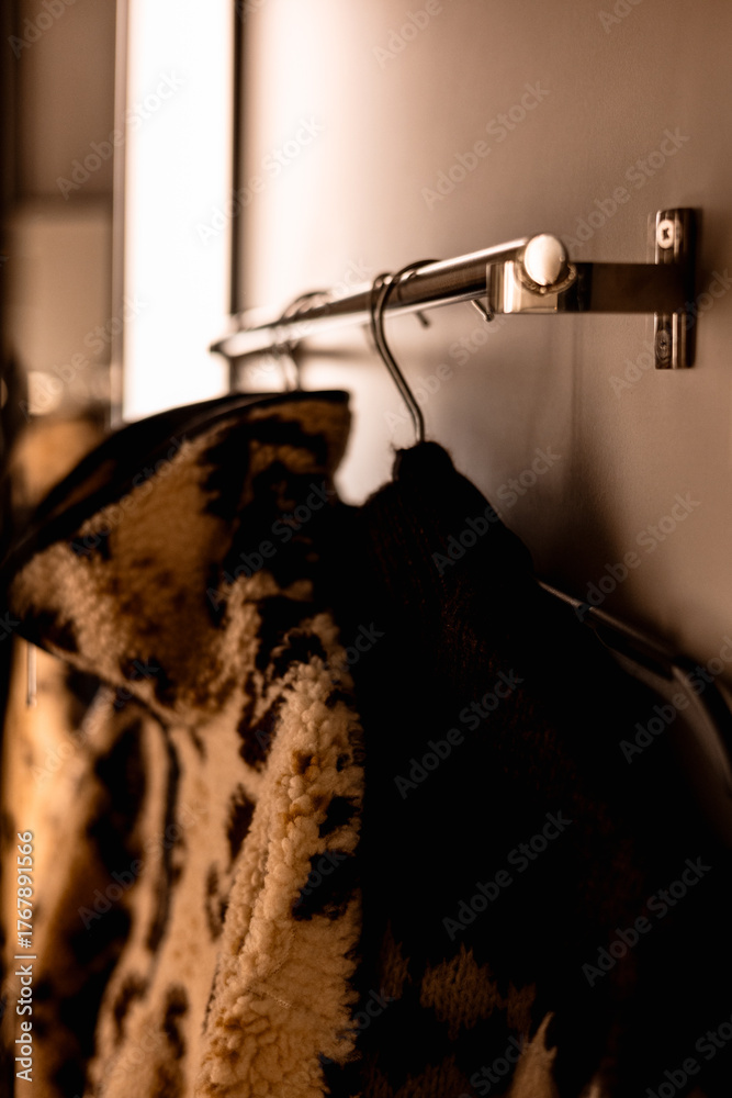 Cozy jacket hanging on a metal rack in a modern interior. A warm fleece jackets hang on a rack, ready for wear, in a sepia-toned room. Warm seasonal clothes in a wardrobe. Warm lighting.
