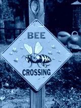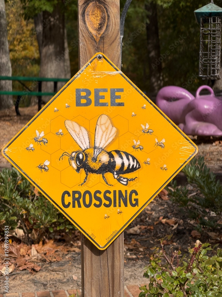 Yellow bee crossing warning sign in front of a playground with a shallow depth of field