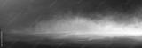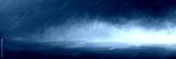 Dark night scene over water, fog over dark ocean water, dark surface, neon light, reflections on the water. Fantasy night water scene.