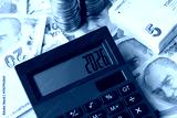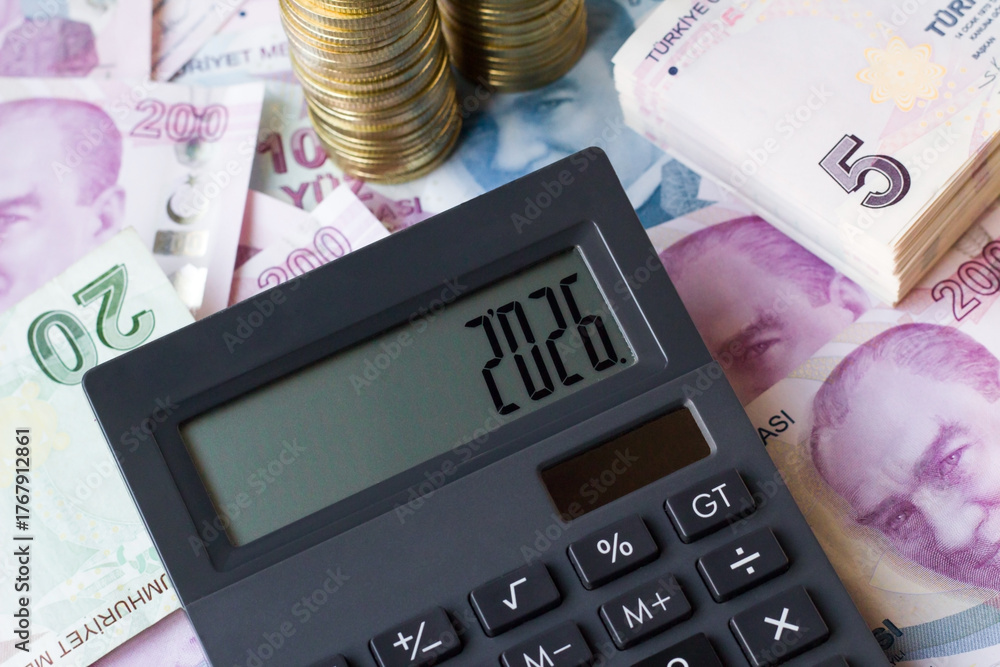 Turkish Money Banknotes on the white surface with coins and black calculator with 2026 numbers on