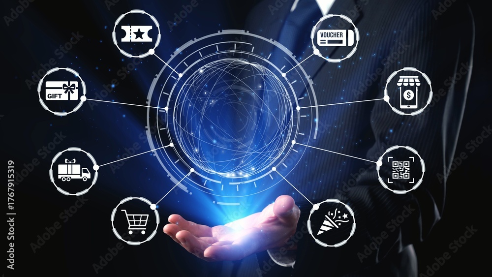 Digital gift card icons show e-commerce, payment, and digital gift card redemption. Digital gift card supports online shopping, secure payment, and customer loyalty programs. Gist