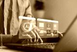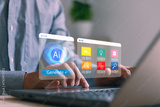 Artificial intelligence concept. Person using laptop with digital AI interface for content creation, data analysis, innovation technology, symbolizing modern automation and smart business solutions.