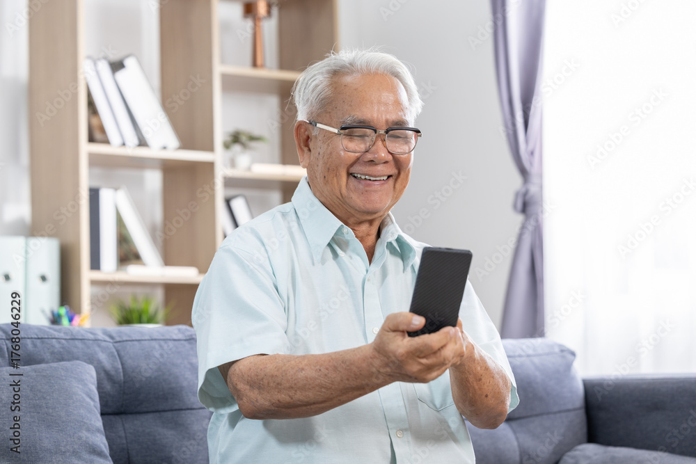 Asian Smiling elderly man holding smartphone on couch wearing glasses in bright living room with bookshelf and curtain, happy relaxed senior using mobile device for video call or messaging