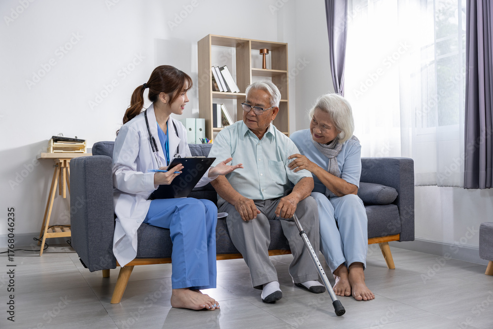 Asian elderly man with cane and supportive partner sit sofa while female healthcare professional scrubs and white coat consults with clipboard, bright living room setting, caring medical