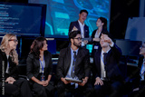 A large IT department meeting in a command center (SOC). An Indian analyst holds a tablet, listening with his team to a cybersecurity update on an AI system.