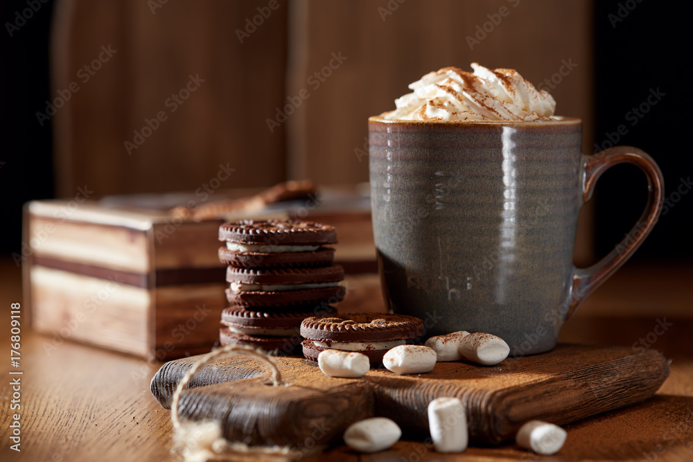 Aroma coffee candy chocolate cookies and spices on the wooden table. Christmas sweets. Dark wooden background. Close. Closeup.