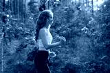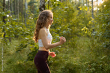 A person jogging energetically in a lush green forest during the beautiful golden hour