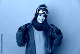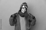 Skier caucasian girl with snowboarding glasses isolated on purple background giving a thumbs up gesture