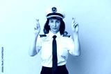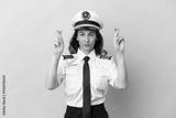 Airplane middle aged pilot woman isolated on pink background with fingers crossing