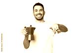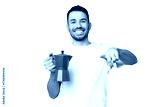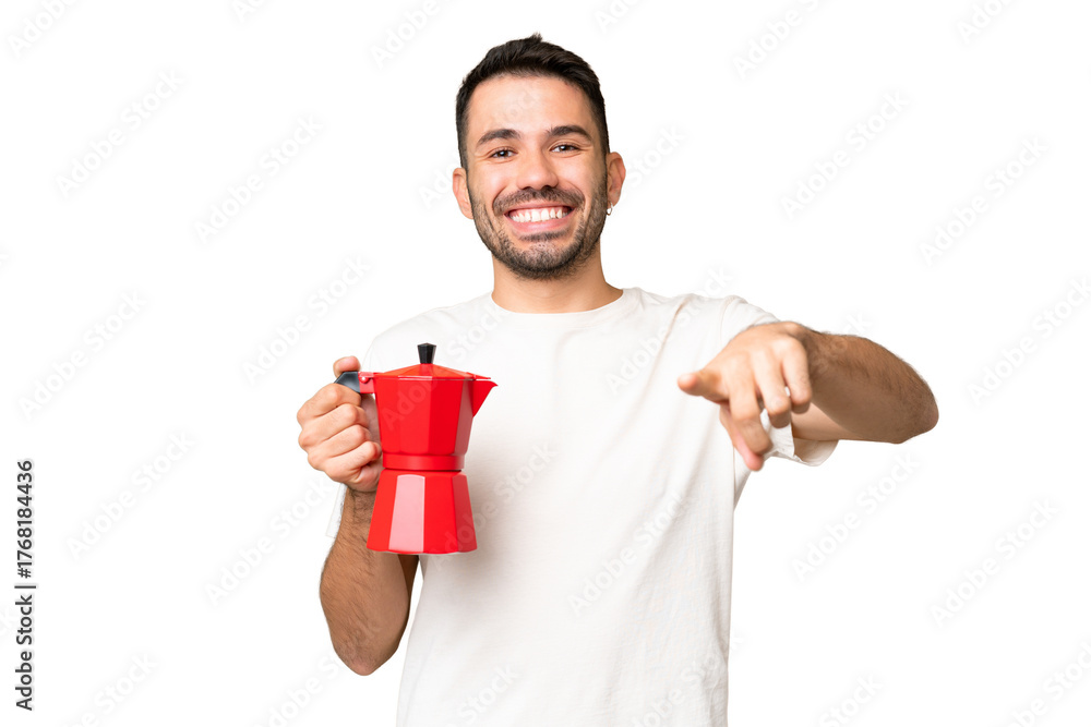 Young caucasian man holding coffee pot over isolated chroma key background points finger at you with a confident expression