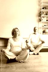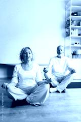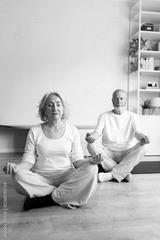 Senior couple meditating together in living room: promoting health and wellness in old age