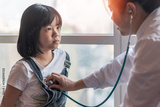 Congenital heart disease defect and pediatric care concept. Asian school child patient with pediatrician doctor examining girl kid health checkup with stethoscope in medical clinic