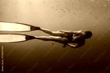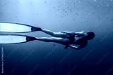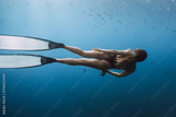 Freediving underwater with long fins, woman exploring deep blue ocean and marine life