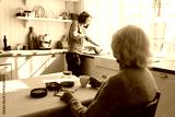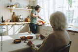 Rare view of senior lady sitting at kitchen table, having herbal tea looking at nurse or caregiver cutting pumpkin standing next to counter, having nice conversation while social worker cooking