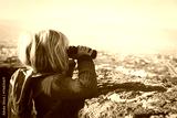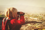 little girl looking through binoculars at panoramic view