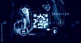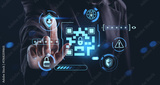 Digital security interface with person interacting with virtual QR code, password icons, and cybersecurity elements on dark background.