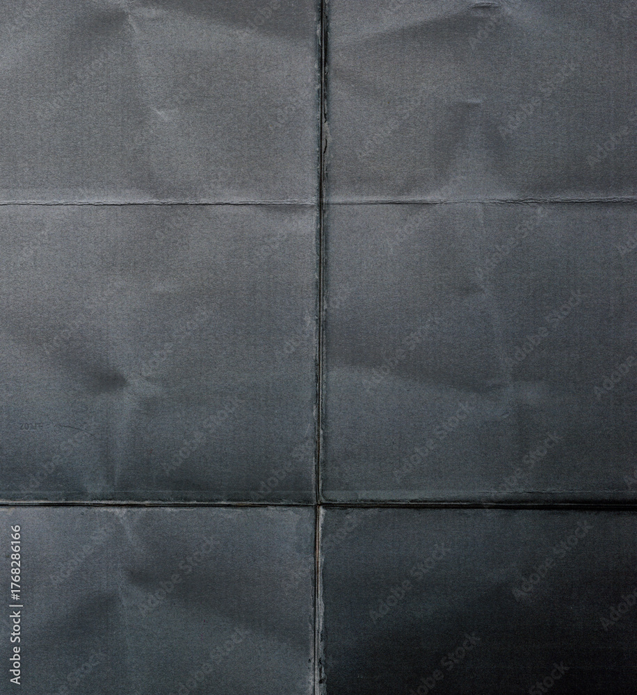 Crumpled dark gray paper texture background. Folded and wrinkled sheet with visible creases and shadows, creating a realistic and detailed paper surface.