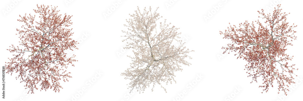 Prunus pumila besseyi tree plan, top view, cutout, transparent background, isolate, Three distinct trees rendered from above with detailed foliage and branches
