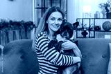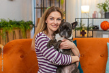 Middle-aged woman embraces French bulldog at home smiles content warm hug comfort and joy. Girl with dog on sofa enjoys cuddle gives care support and affection tender portrait closeup for stock buyers