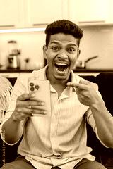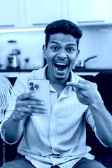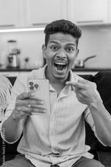 Indian man at home watches wow video on smartphone feels shock laughs smiles excited by news. Arabian guy on sofa shares link in messenger sends to friends writes short reply and posts reaction emoji
