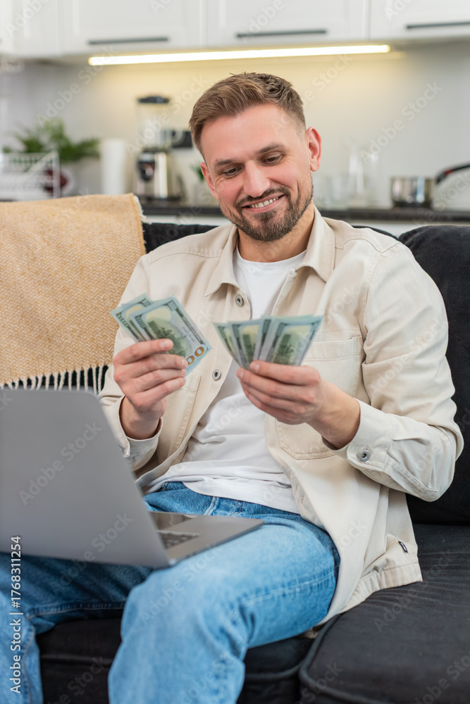 Young man at home checks laptop and cash dollars compares totals fills sums smiles after steady progress. Caucasian guy on sofa reviews earnings counts bills confirms target shows joy and proud mood.
