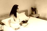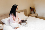 Young businesswoman working on laptop in hotel room, sitting on bed with cozy atmosphere, showcasing remote work lifestyle and modern professional environment