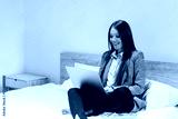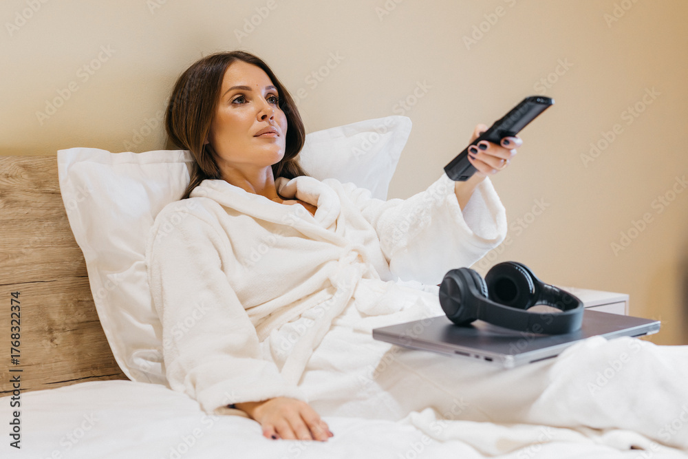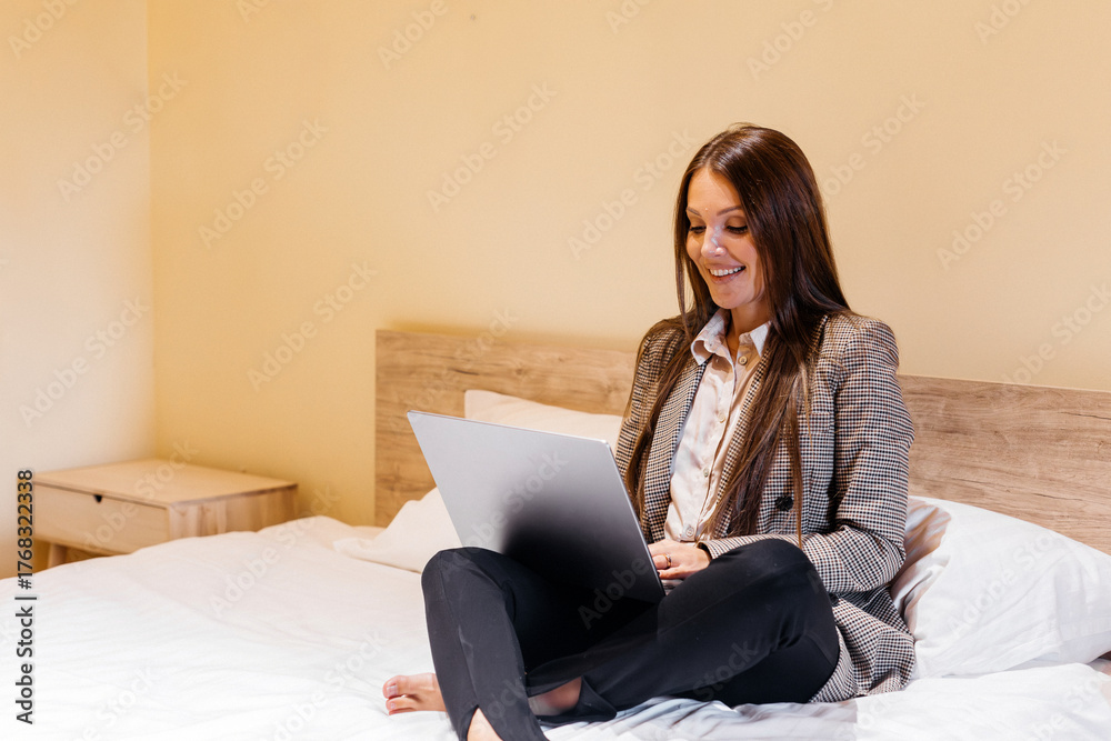 Young businesswoman sitting on hotel bed, working on laptop, dressed in professional attire, with cozy room ambiance, showcasing remote work lifestyle and productivity