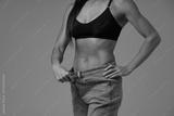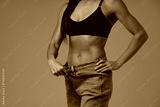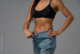 Woman in black top proudly holding oversized jeans after weight loss achievement