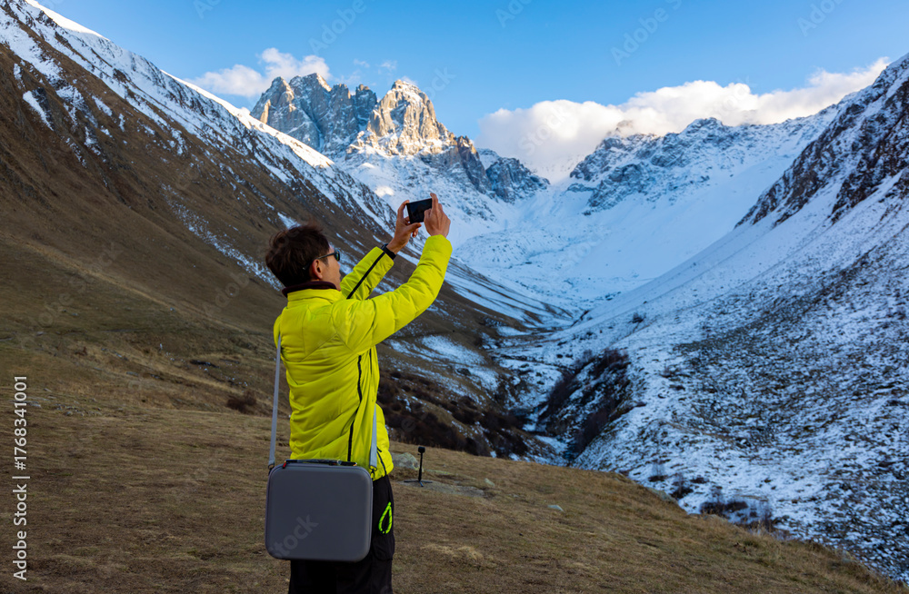 Asian Man taking photo of snowy at caucasus mountains in georgia
