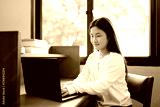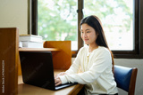 Young Asian woman studying in a library using a laptop and book. Ideal for concepts like education, learning, focus, university