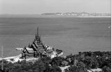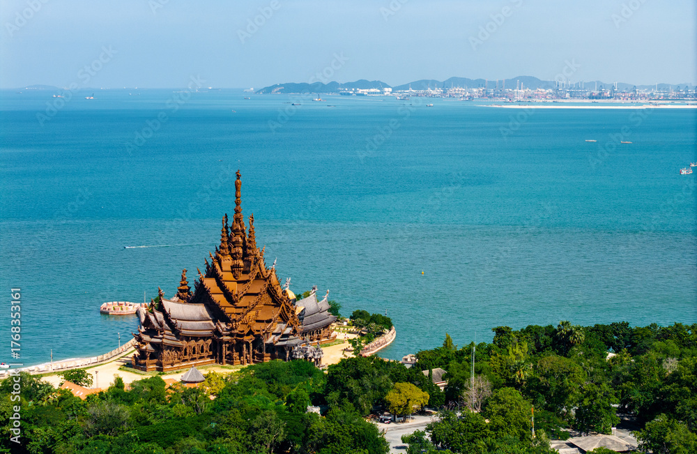 Sanctuary of Truth wooden temple in Pattaya Chonburi Thailand, aerial top view. Concept Thai landmark of religion Buddhism