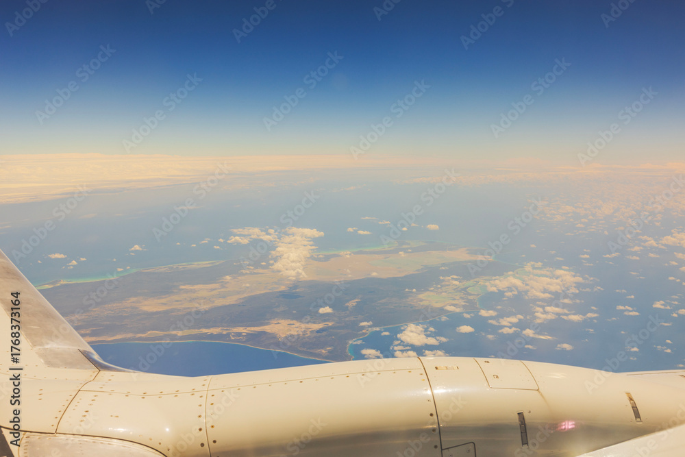 Airplane wing flying above clouds and coastline with bright blue sky on background during daytime flight. USA. Miami.