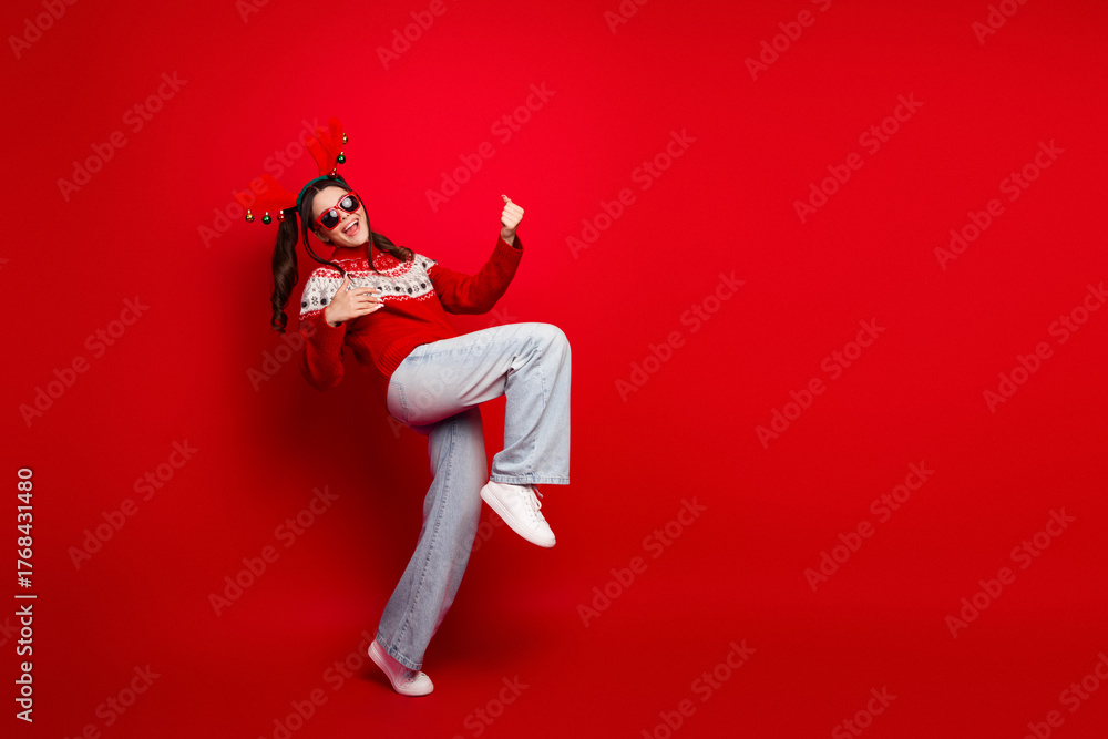 Young woman in red Christmas sweater with reindeer antlers poses playfully against a bright red background for a festive stock photo