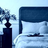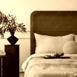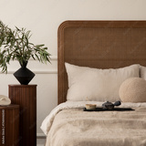 Cozy composition of bedroom interior with cozy bed, beige bedding, wooden bedside table, rattan armchair, patterned pillow and personal accessories. Home decor. Template.
