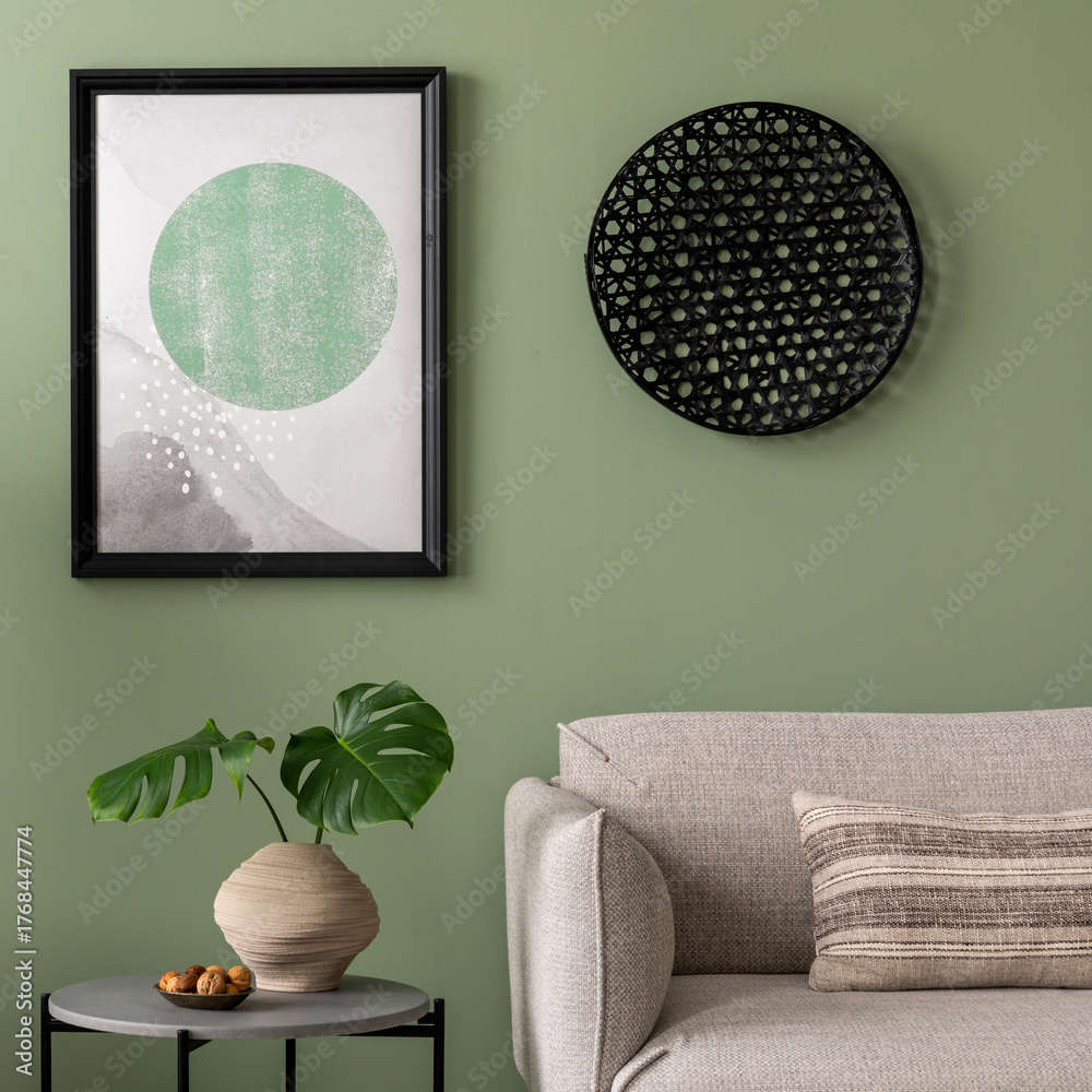 The stylish composition at living room interior with mock up, green wall, design gray sofa, coffee table and elegant personal accessories. Beige pillow and plaid. Mock up poster. Template.