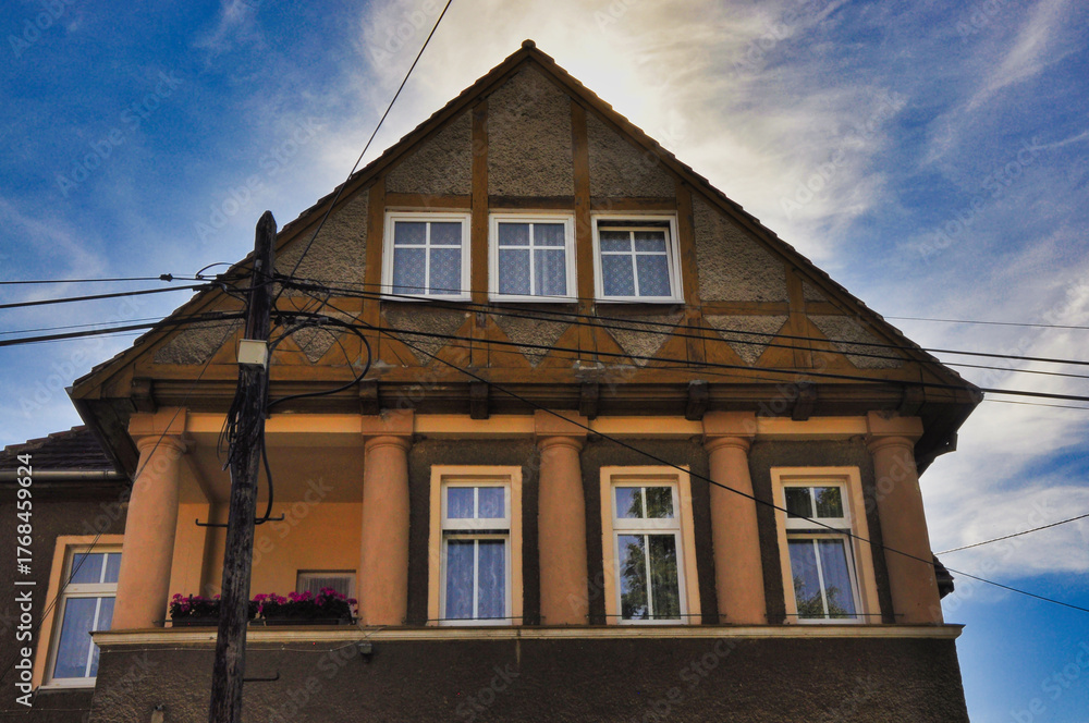 Stare Bogaczowice – zabytkowa fasada domu z muru pruskiego z kolumnami pod jasnoniebieskim niebem i liniami energetycznymi.