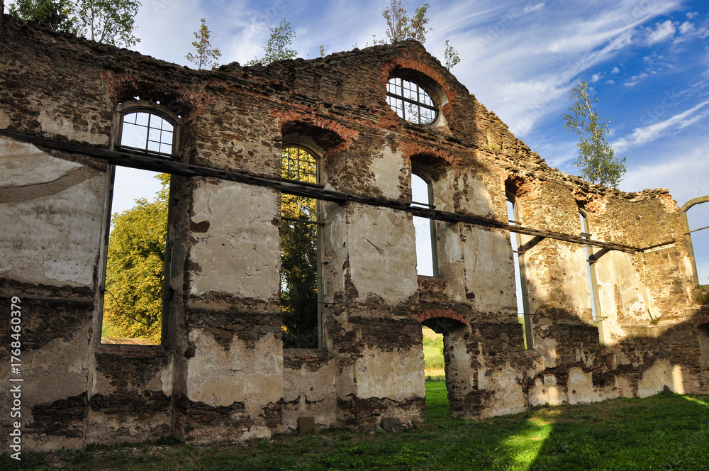 Gostków – ruiny kościoła ewangelickiego z XVIII w. Renesansowy mur z łukowymi oknami w rozświetlonym słońcem wiejskim krajobrazie.
