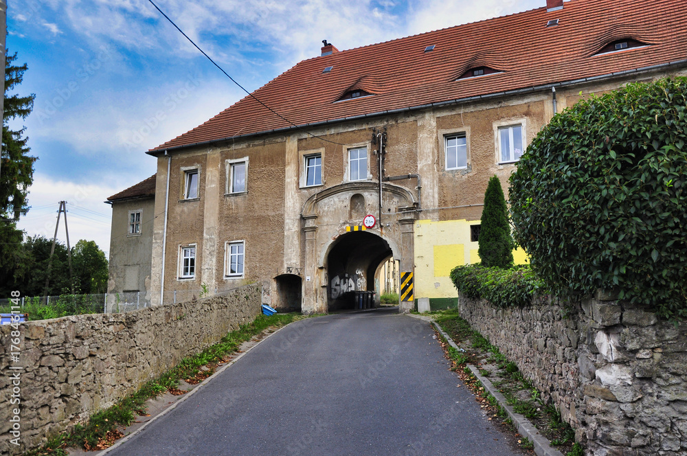 Zespół klasztorny cystersów (dawny), Stare Bogaczowice. Brama łukowa pod starym budynkiem z kamiennymi murami wzdłuż wiejskiej drogi.