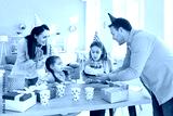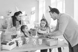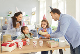 Joyful family celebrating child birthday at home, son making wish and blowing candles. Happy parents and kids wearing party hats enjoying festive atmosphere with gifts and cake. Warm family moment.