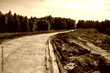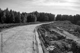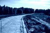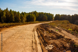 A winding dirt track leads through a rural landscape, flanked by green-golden woods under a clear sky. A rough road by an old quarry on a bright autumn day