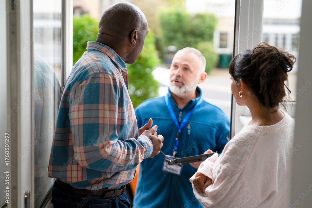 Home visit by a service representative engaging with residents in a friendly and helpful manner during the day