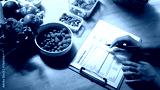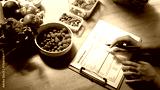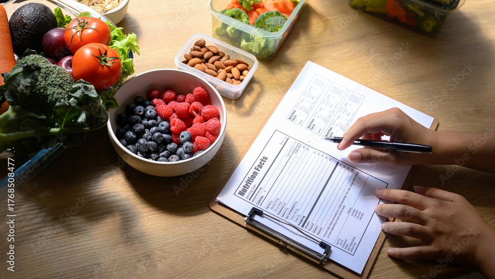 Nutritionist writing a healthy meal plan with fresh fruits, vegetables, and nuts on the table