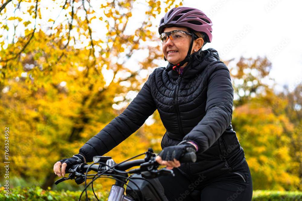 Middle aged beautiful woman riding bicycle in city park in autumn. Side view