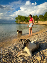Mixed breed dog resting on beach pebbles while young woman and her brown furry friend wade in shallow water. Relaxing walks and bonding with pets under bright summer light and clear turquoise sea.