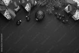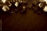 Christmas background with xmas tree, decorations, gifts, presents and sparkle bokeh lights on green background. Merry Christmas greeting card. Winter holiday theme. Happy New Year. Space for text